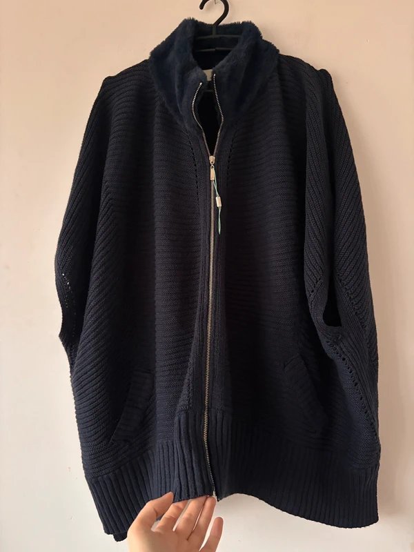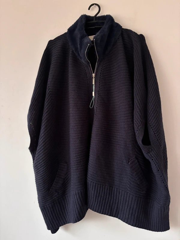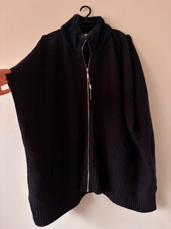 Poncho, sweater, knitwear, oversize, navy, warm, zip, fauxfur, collar, stylish, autumn, winter, chunkyknit, wrap, woman, casual