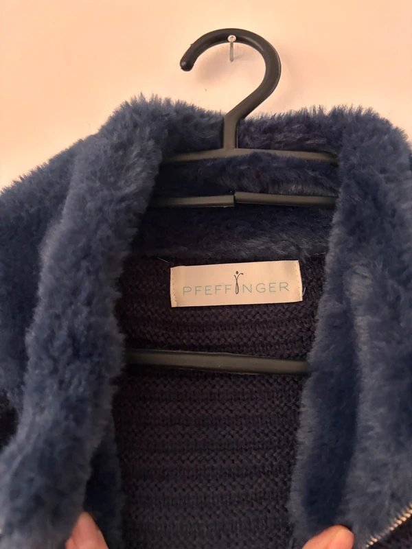 Gruba, strukturalna dzianina.Wysoki kołnierz typu stójka, ozdobiony miękkim sztucznym futerkiem w dopasowanym kolorze.