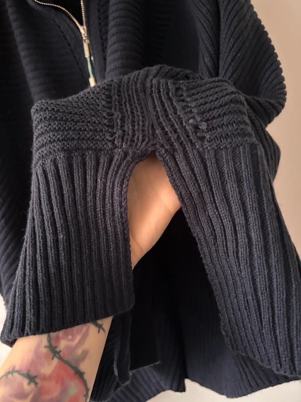 Wspaniałe, przytulne i bardzo ciepłe ponczo-sweter w głębokim granatowym/prawie czarnym kolorze.