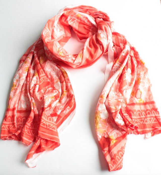 Miękki, duży szal w żywych kolorach. Materiał to prawdopodobnie bawełna lub wiskoza.