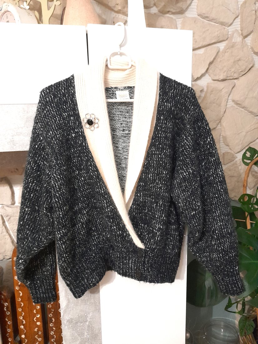 Elegancki sweterek w tonacji szaro-czarnej z kontrastującym kołnierzem.