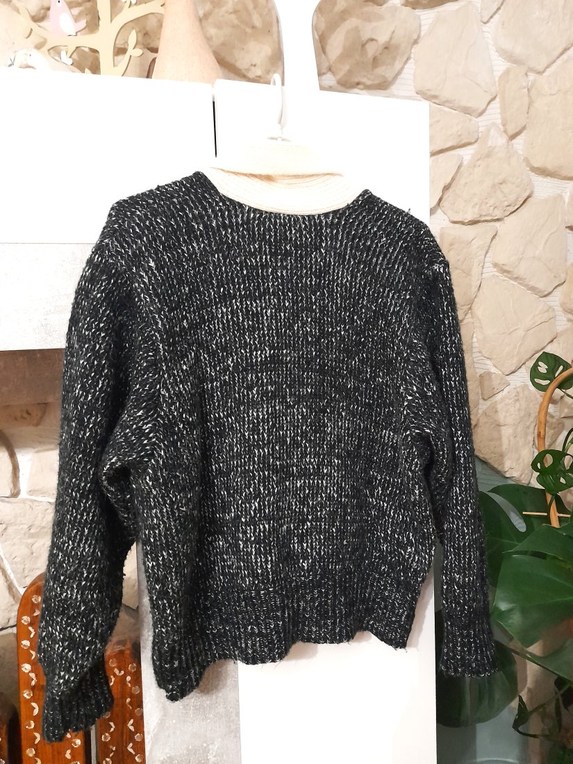 Elegancki sweterek w tonacji szaro-czarnej z kontrastującym kołnierzem.