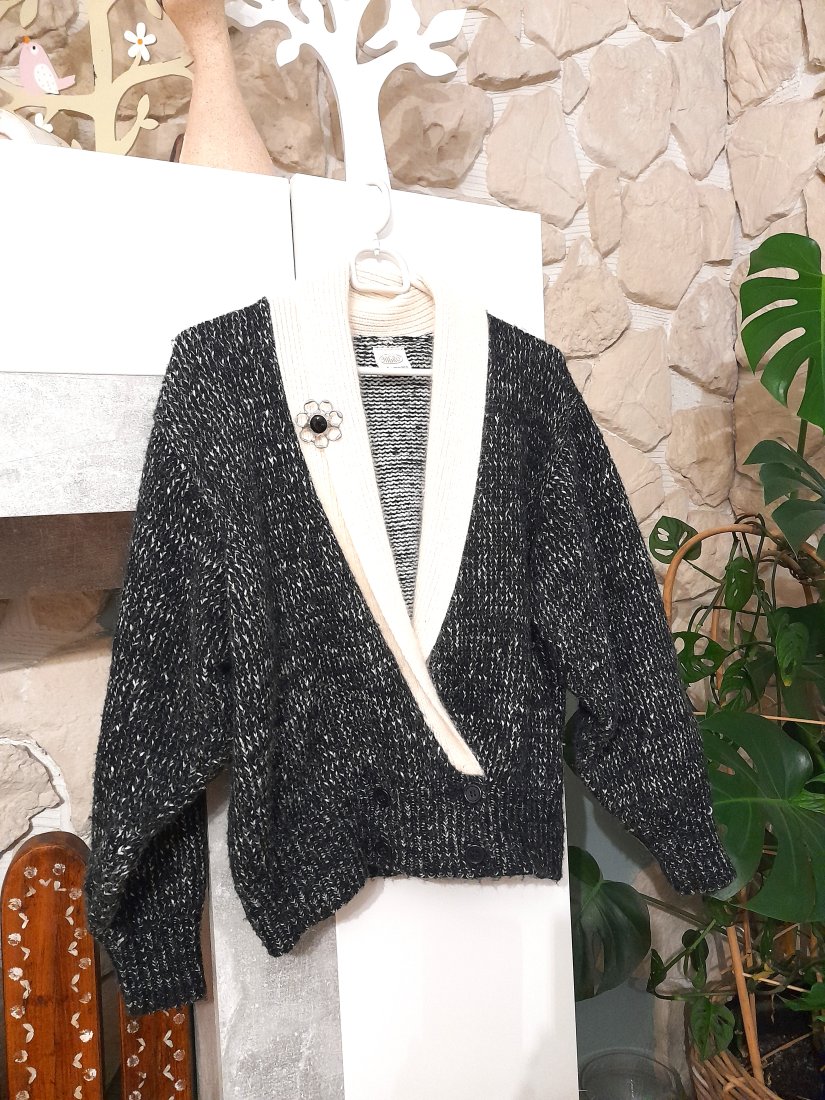 Elegancki sweterek w tonacji szaro-czarnej z kontrastującym kołnierzem.