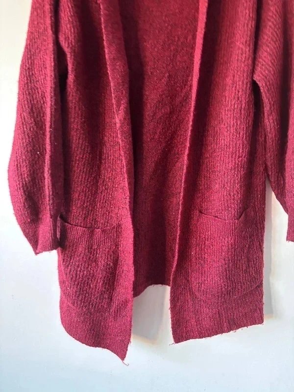 Idealny, długi kardigan w modnym, głębokim odcieniu burgundu/bordowym melanżu. Wykonany z mięsistej, ciepłej dzianiny o lekko puszystej i strukturalnej fakturze. Fason jest luźny (oversize), otwarty (typu narzutka) i sięga za biodra. Posiada dwie duże, praktyczne kieszenie naszyte z przodu. Szerokie rękawy zakończone są delikatnym ściągaczem.