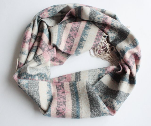 Miękki, duży, ciepły szal w pastelowym odcieniu różu i w odcieniach szarości.