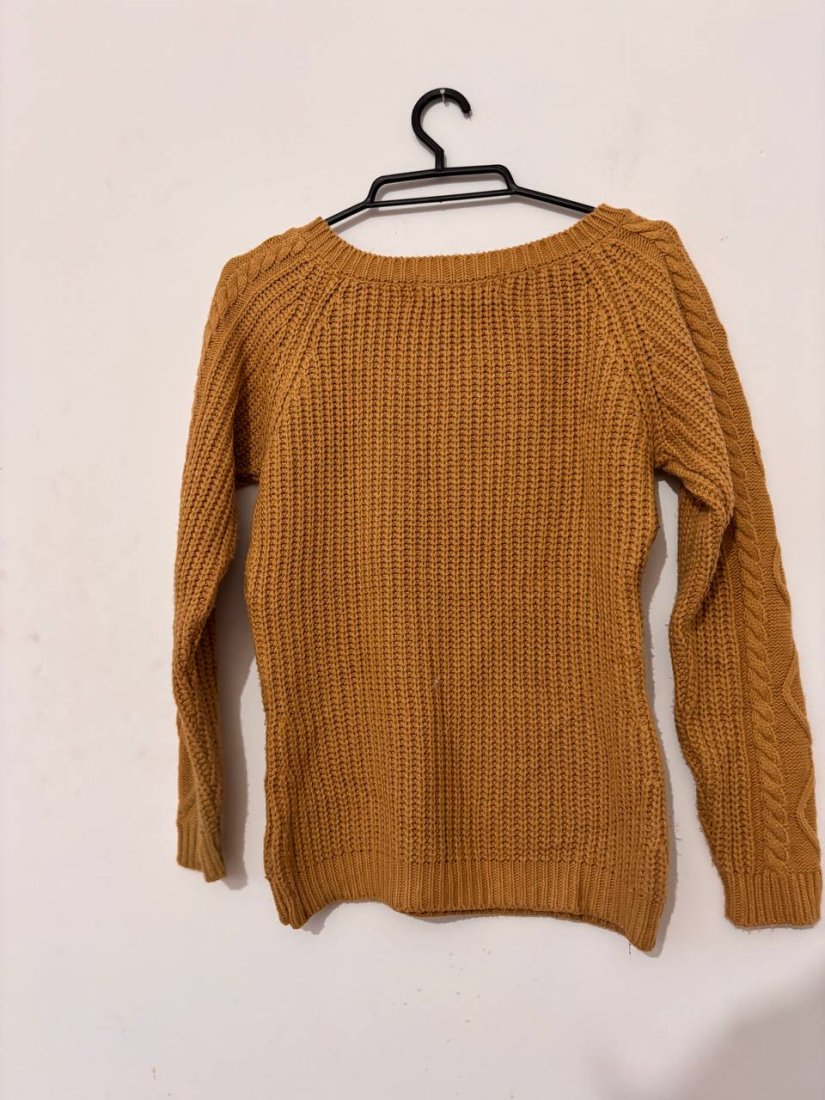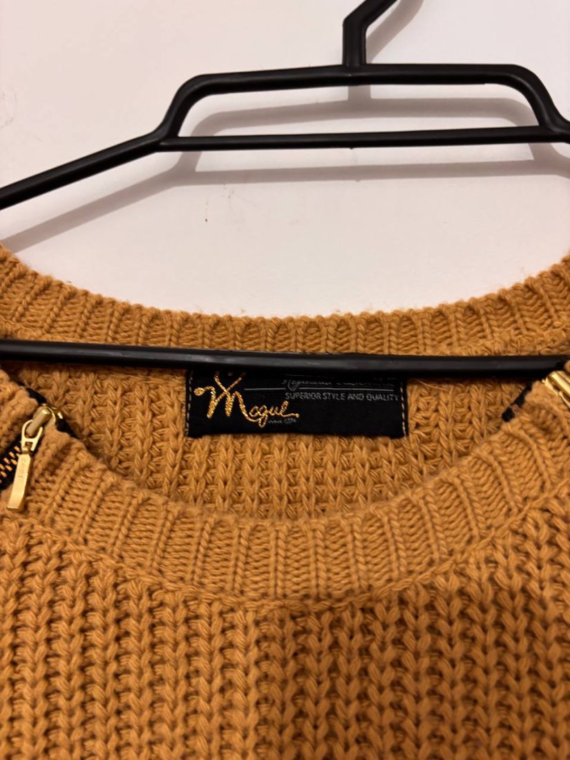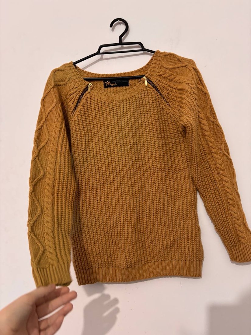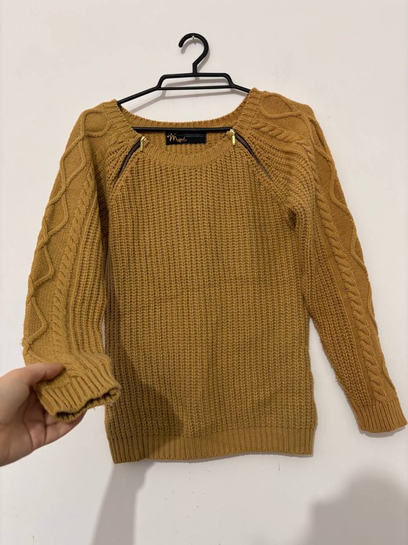 Ciepły sweter marki Magus w modnym musztardowym kolorze. Wykonany z miękkiej, przyjemnej przędzy o gęstym splocie. Rękawy ozdobione klasycznym warkoczowym wzorem, a przy dekolcie znajdują się dekoracyjne złote suwaki, które dodają całości charakteru. Idealny na chłodne dni