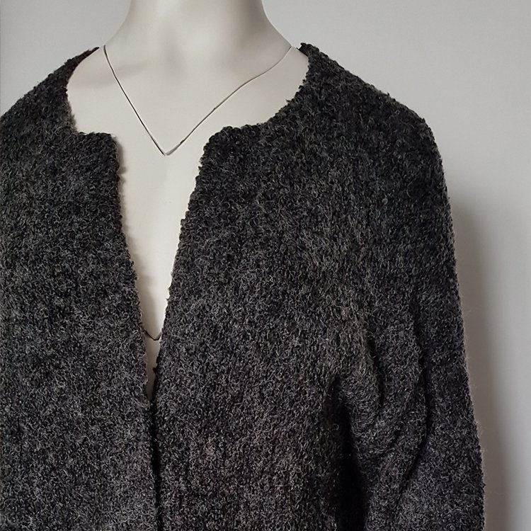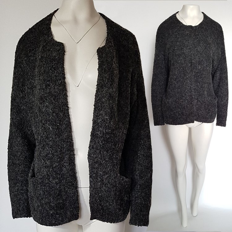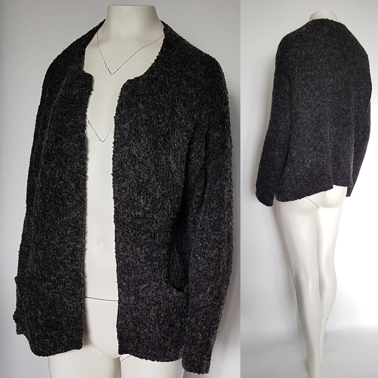 Przyjemny surowy kudłacz z domieszką wełny marki ENVII, wykonany z melanżowej szarej dzianiny. Krój lekko oversizowy, swobodny o obniżonej linii ramion, zapinany na zatrzaski, z przodu 2 kieszenie. Idealny do wylegiwania się w domu lub zestawienia z lekką kwiecistą sukienką.