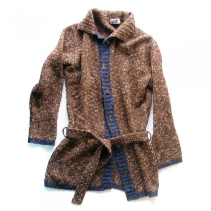 Dłuższy sweter wełniany typu boucle w dwóch odcieniach - czekoladowym i ultramarynowo-fioletowym (lamówki). Zapinanay na guziki. Poniżej pasa wiazany paskiem. Rozmiar : brak metki, ale wypada na L lub ewentualnie duuuże M. Długość tunikowa, zakrywa pupę. Bardzo ciepły.