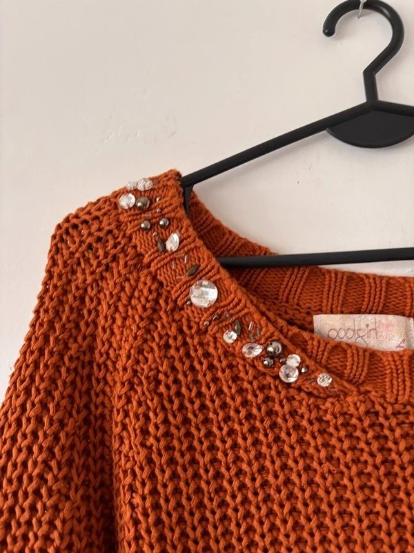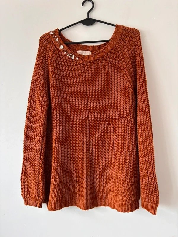 Ciepły, miękki sweter w pięknym odcieniu terakoty. Gruby, luźny splot o strukturze "chunky knit", idealny na jesień i zimę. Przy dekolcie ozdobne kryształki i koraliki, które dodają elegancji i sprawiają, że sweter wyróżnia się na tle klasycznych modeli.