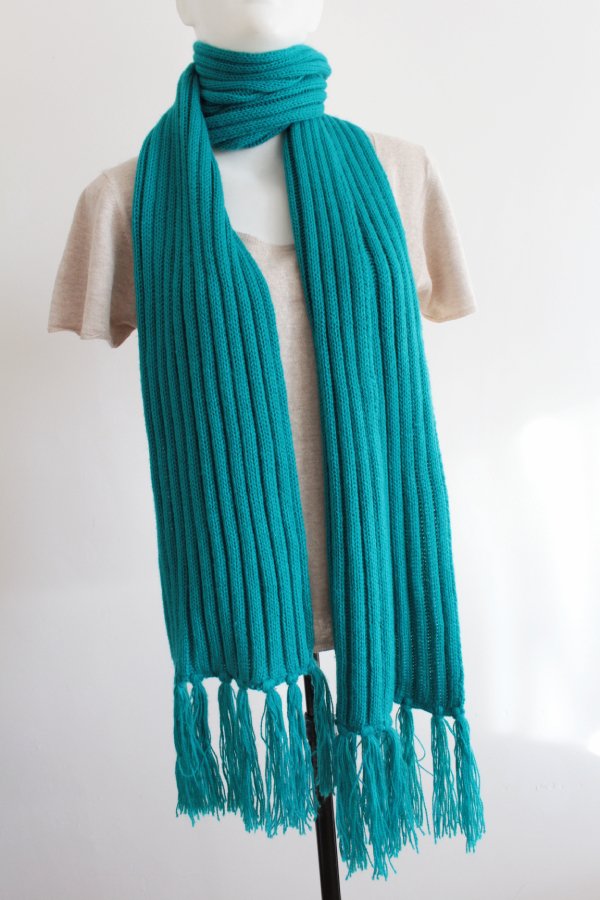 Długi, mięsisty w dotyku szal vintage w pięknym, niesamowicie twarzowym odcieniu turkusu. Można owinąć go wokół szyi dwukrotnie, a także wiązać na różne sposoby. Jest duży, jednak niezbyt szeroki, dzięki czemu łatwo go stylizować i nie daje efektu przytłoczenia sylwetki.