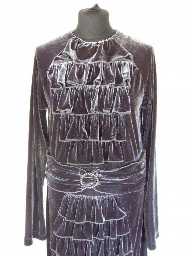 Unikatowa długa aksamitna sukienka w stylu edwardiańskim ozdobiona z przodu od góry do samego dołu falbankami, trochę poniżej pasa klamra ozdobiona cyrkoniami. Sukienka jest zapinana z tyłu na zamek, elastyczna.