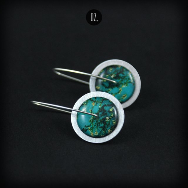 Kolczyki ze srebra i aluminium, folkowa grafika zatopiona w żywicy (fragment obrazu Van Gogha Gałęzie Kwitnącego Migdałowca), tarcze ok. 2 cm, długość całego kolczyka ok. 3,7 cm.