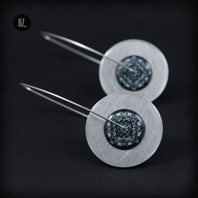 długie kolczyki ze srebra i aluminium, fragment grafiki Małgorzaty Domańskiej, zatopiony w żywicy, tarcze ok. 3 cm, długość całego kolczyka ok. 6,8 cm.