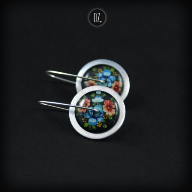 Kolczyki wykonane ze srebra i aluminium, grafika zatopiona w żywicy, tarcze ok. 2 cm, długość całego kolczyka ok. 3,3 cm. Kolczyki wysyłam w eleganckim opakowaniu, dołączam silikonowe zatyczki.
