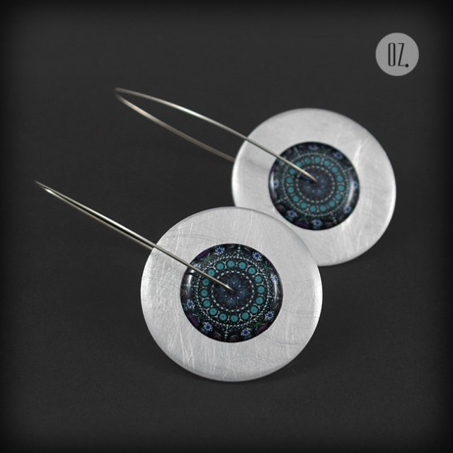 długie kolczyki ze srebra i aluminium, folkowa grafika zatopiona w żywicy, tarcze ok. 4 cm, długość całego kolczyka ok. 7,5 cm. Elementy ruchome. Kolczyki wyjątkowo lekkie mimo dużych rozmiarów.