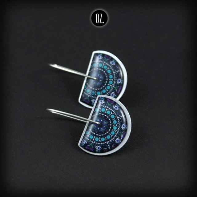 Kolczyki ze srebra i aluminium, folkowa grafika zatopiona w żywicy, tarcze ok. 2,5 cm, długość całego kolczyka ok. 3,5 cm.