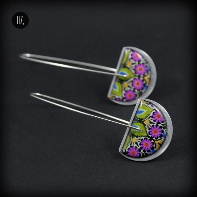długie kolczyki ze srebra i aluminium, folkowa grafika zatopiona w żywicy,