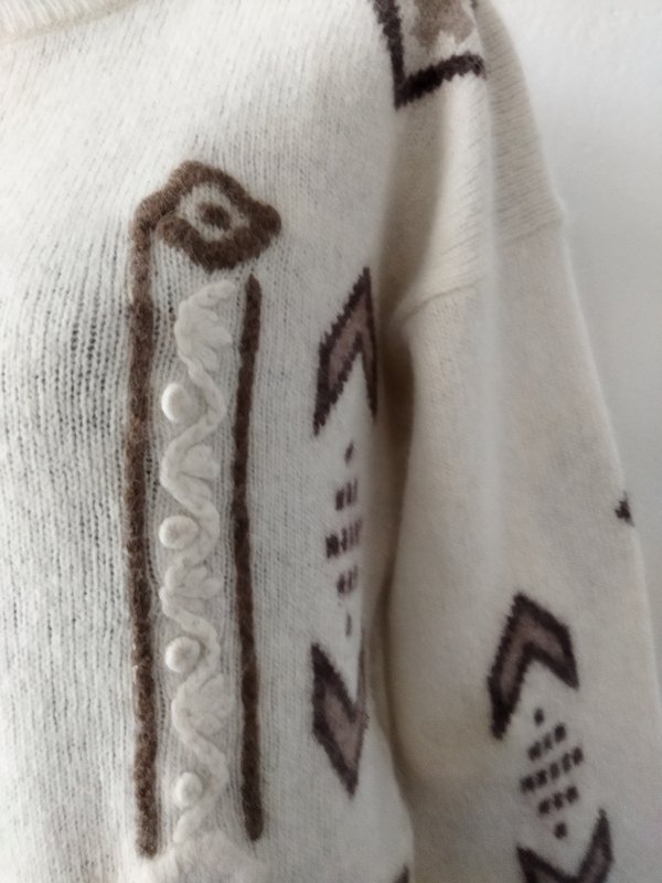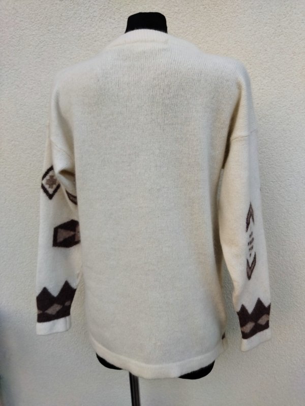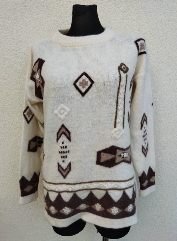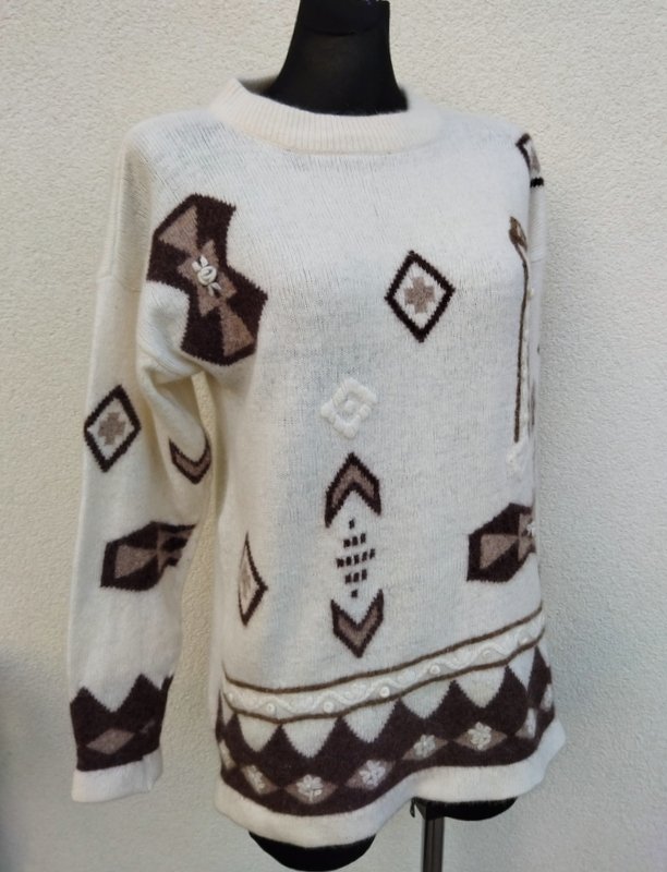 Świetnej jakości miły sweter z dużym udziałem angory w składzie, w kolorze mlecznej bieli z wzorami w kolorze czekoladowego brązu i cappuccino. Zdobiony subtelnymi przestrzennymi haftami z tej samej włóczki.