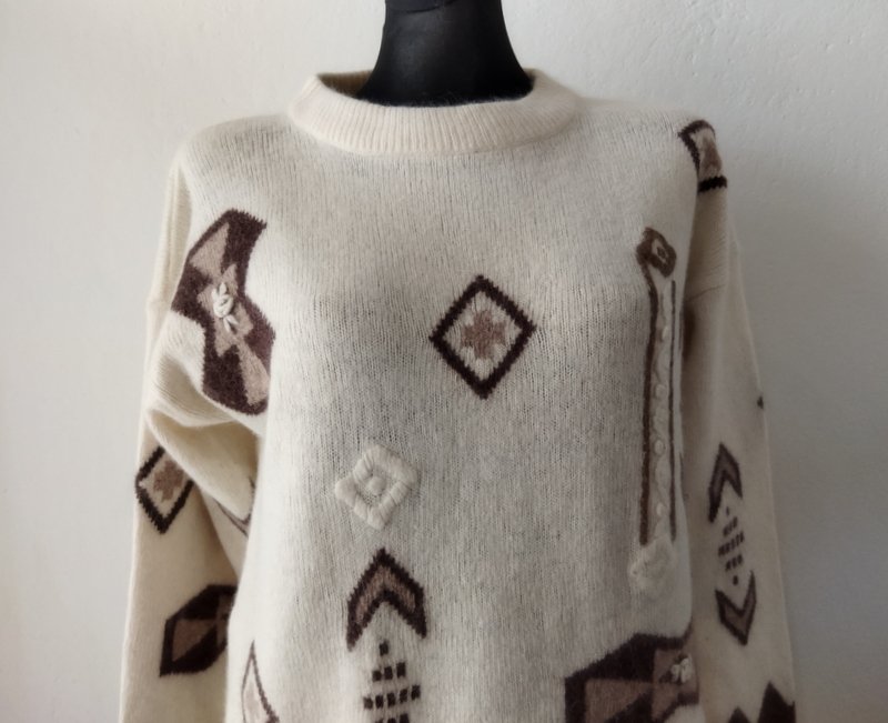 Świetnej jakości miły sweter z dużym udziałem angory w składzie, w kolorze mlecznej bieli z wzorami w kolorze czekoladowego brązu i cappuccino. Zdobiony subtelnymi przestrzennymi haftami z tej samej włóczki.