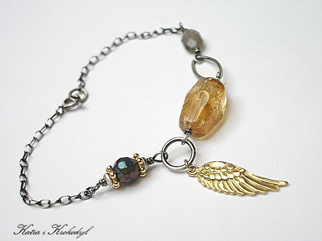 Delikatna bransoletka wykonana w całości ze srebra i srebra pokrytego 24k złotem [pr. 925] w połączeniu z ,fasetowaną kuleczką labradorytu mystic,[6mm] ,nieforemną bryłką labradorytu [8mm] ,bryłką cytrynu [16mm] oraz złoconą zawieszką [24mm] . Srebro częściowo oksydowane i przetarte. Całkowita długość bransoletki około 19cm. Biżuteria ozdobnie zapakowana.