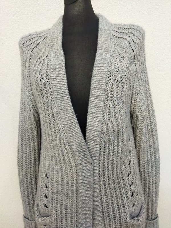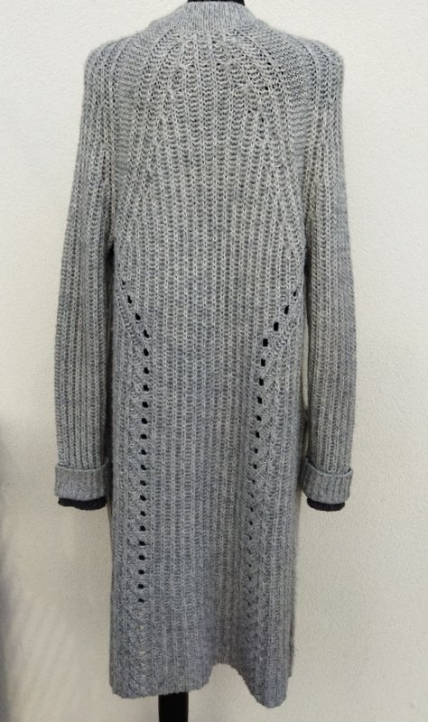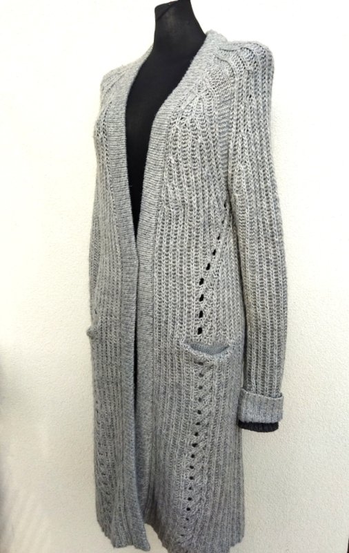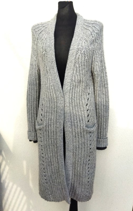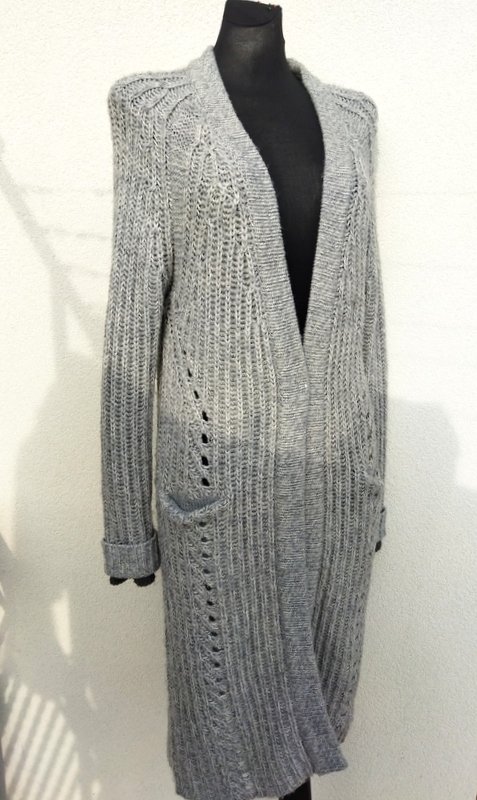 Długi sweter typu kardigan z akrylowej włóczki z domieszką, w melanżowym jasnoszarym kolorze wykonany mięsistym angielskim ściegiem miejscowo ażurowy wzór. Fason otwarty , dekolt w szpic , dwie wpuszczane kieszenie, rękawy raglanowe z podwójnymi mankietami - drugie ciemnoszare wystające doszywane od wewnętrznej strony.