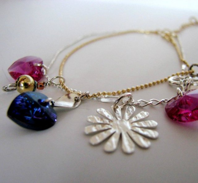 Delikatne, leciutkie bransoletki w całości wykonane ze srebra. Rozświetlone kryształkami swarovskiego w żywym odcieniu fuksji i heliotropu. Długość użytkowa drobniutkich łańcuszków: 16.5 cm, wielkość serduszek: 10 mm, średnica fakturalnego kwiatuszka: 15 mm.