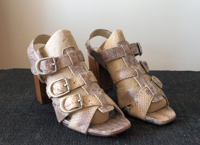 buty marki Clarks produkcji brazylijskiej, na solidnym drewnianym obcasie. nie ma informacji czy jest to skóra, mnie wydaje się, że tak, są niesłychanie miękkie, nawet chyba pachną jak skóra. Rozmiarówka na bucie 6. Długość wkładki 24,8, więc chyba bardziej 38-38,5. wysokość obcasa 8,5 cm. Stan bardzo dobry, przybrudzenie widoczne tylko od spodu na podeszwie.