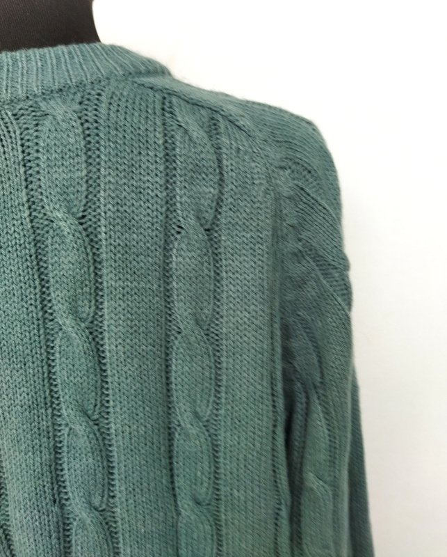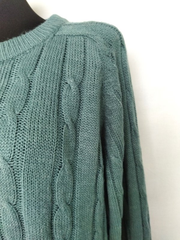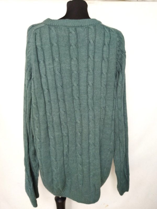 Miły , mięciutki męski sweter z akrylowej włóczki w kolorze ciemnej mięty z warkoczowym wzorem, Rękawy raglanowe. Wykończony ściągaczami.