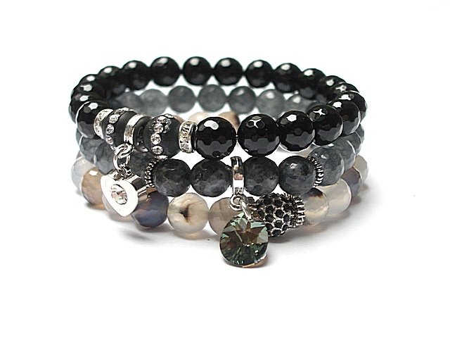 PROJEKT AUTORSKI. WSZELKIE INNE PODOBNE MODELE TO KOPIE NARUSZAJĄCE PRAWA AUTORSKIE. Komplet trzech bransoletek wykonanych z naturalnych kamieni: agaty botswana fasetowane [8mm], jadeity fasetowane [8mm], onyks fasetowany [8mm], larvikit fasetowany [8mm], onyks wysadzany cyrkoniami [8mm], ekskluzywnej przekładki wysadzanej cyrkoniami, przywieszki z kryształkiem Swarovskiego oraz elementów metalowych w kolorze srebra. Bransoletki pasują na nadgarstek 16 - 17cm. Biżuteria ozdobnie zapakowana