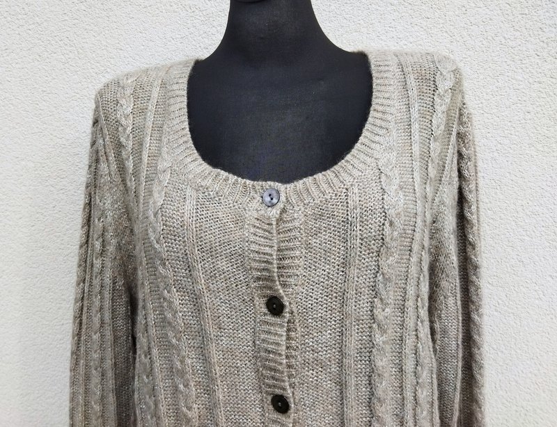 Elegancki o dobrym składzie jakościowym rozpinany sweter typu kardigan w kolorze chłodnego beżu z wplecioną dyskretna metaliczna srebrna nicią . Z Warkoczowym wzór , owalny dekolt, wyższy ściągacz u dołu swetra i rekawów
