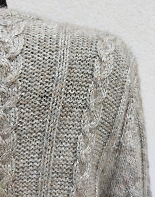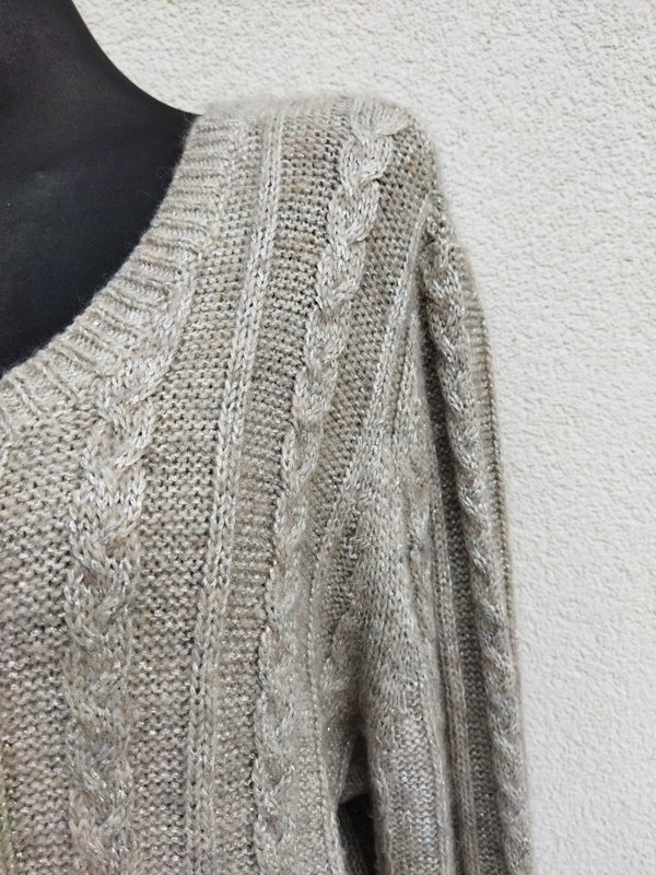 Elegancki o dobrym składzie jakościowym rozpinany sweter typu kardigan w kolorze chłodnego beżu z wplecioną dyskretna metaliczna srebrna nicią . Z Warkoczowym wzór , owalny dekolt, wyższy ściągacz u dołu swetra i rekawów