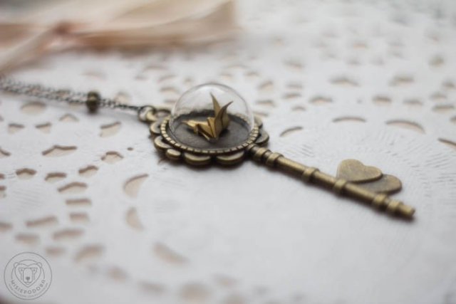 Delikatny, maleńki, papierowy żuraw - japoński symbol szczęścia, zdrowia i pokoju. Podobno, jeśli w jakiejś intencji złoży się tysiąc żurawich figurek, to życzenie się spełni. My spełniamy życzenia tym zjawiskowym wisiorkiem. Papierowy żuraw ukryty w szklanej kopułce, o średnicy 2 cm. Część ozdobna zawieszona na łańcuszku o długości 35 cm. Długość bazy klucz - 7 cm. Całość w kolorze starego złota/brązu.