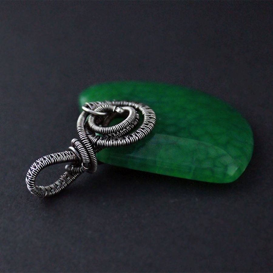 Cały wisiorek ma wymiary 5,1 x 5 cm i prezentuje się wspaniale jako biżuteryjny akcent, który nadaje każdej stylizacji tajemniczości i elegancji. Zaoksydowane srebro, otaczające kamień, kontrastuje z jego soczystą zielenią, tworząc piękną grę kolorów i faktur, które podkreślają naturalne piękno agatu. Technika wire-wrapping nadaje wisiorkowi niepowtarzalnego charakteru, sprawiając, że jest on zarówno dziełem sztuki, jak i doskonałym dodatkiem do Twojej kolekcji biżuterii. Wymiary wewnętrzne oczka wynoszą 0,8 x 0,5 cm - idealnie pod rzemień.