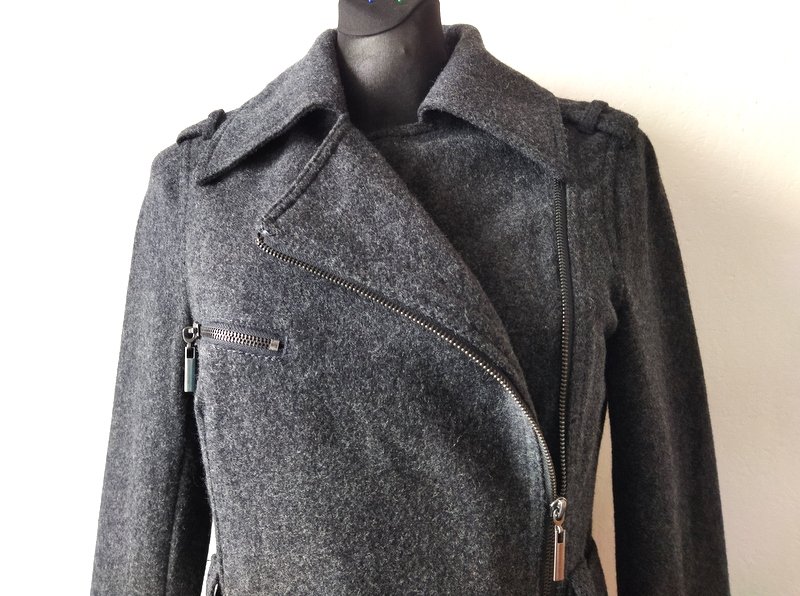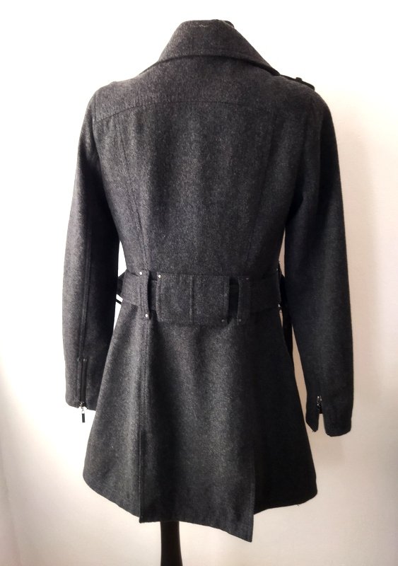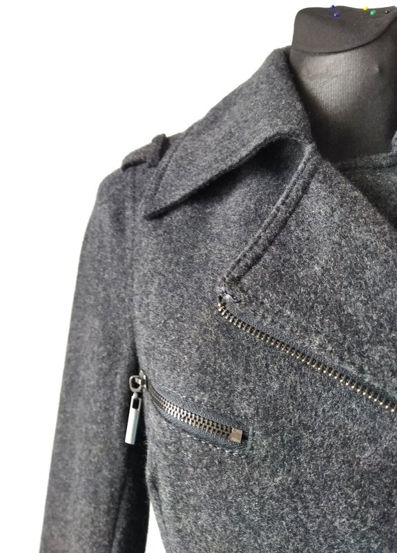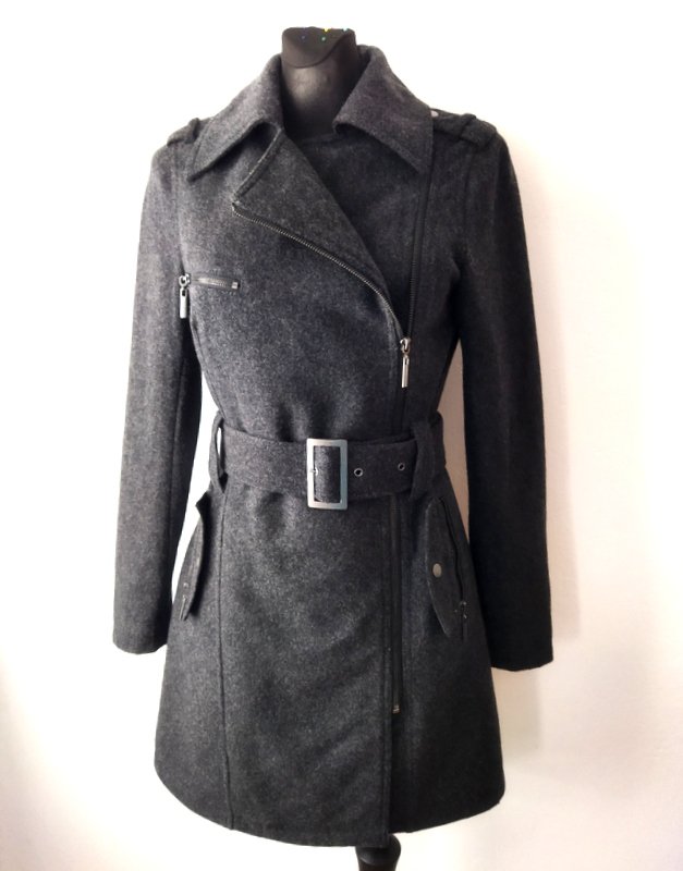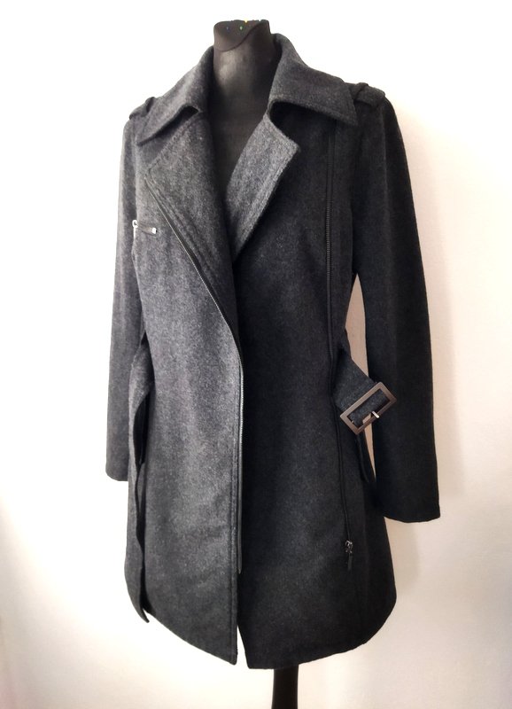 Zgrabny płaszcz w grafitowym kolorze z wełnianej tkaniny z domieszką wiskozy , starannie uszyty i wykończony z duża dbałością o szczegóły Taliowany, z asymetrycznym zapięciem na zamek, z kołnierzem z rewersami z możliwością zapięcia pod samą szyję , z dwiema wpuszczanymi kieszeniami z zamkami i patkami i jedną mniejszą kieszonką u góry , rękawy u dołu z rozsuwanymi zamkami, . W talii pasek z klamerką. Z tyłu karczek i dwa kryte rozcięcia . Całość na podszewce.