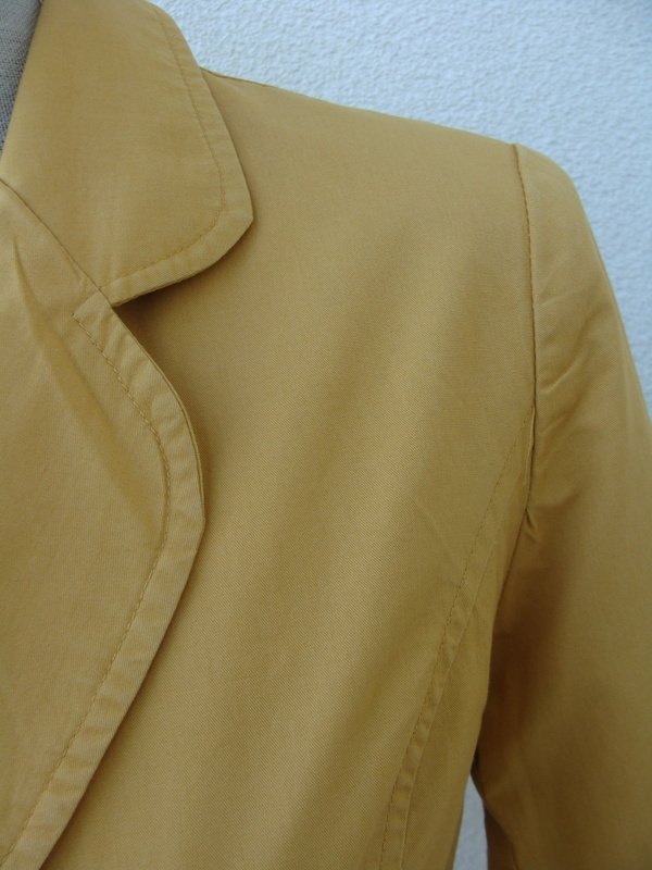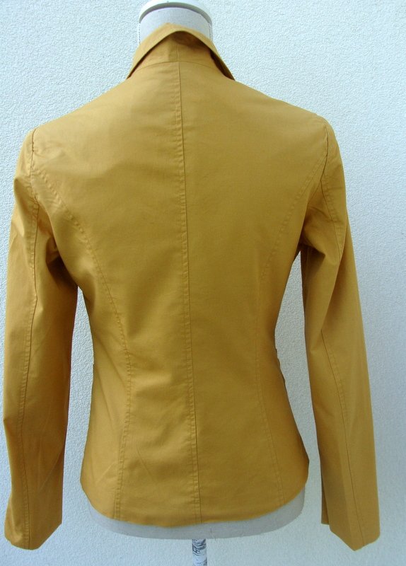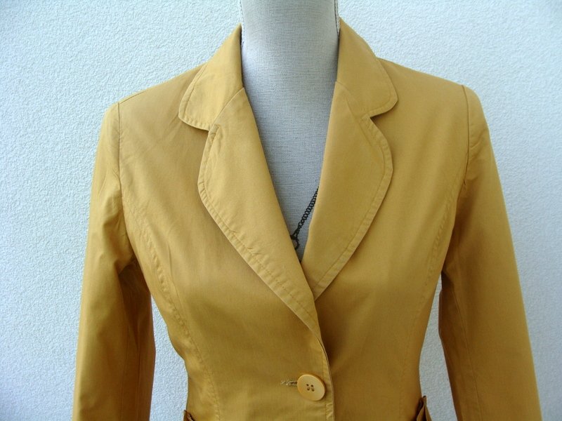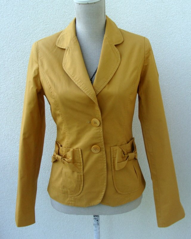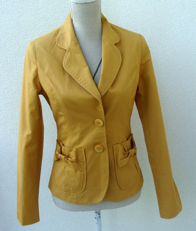 zgrabna marynarka w kolorze miodowej żółci. Z kołnierzem z rewersami, z dwiema naszywanymi kieszeniami z ozdobnymi kokardkami, poły przodu lekko zaokrąglone. Zapinana na dwa ozdobne guziki. Całość na podszewce w kolorze marynarki.