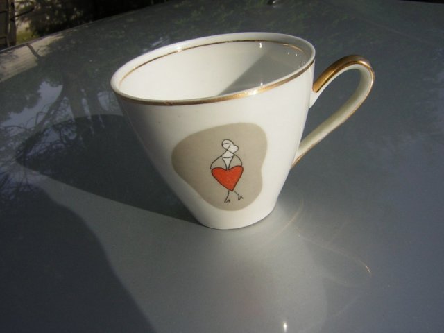 Filiżanka Porcelanowa sygnowana ĆMIELÓW z lat 60-ych. Seria KARCIANA. Uchowało się ich niewiele - niestety. Tutaj samotne KIER. Cienka, szlachetna porcelana i fantastyczne zdobienie obustronne. Złocenie na uchu, rancie i cienkim wewnętrzym pasku. Fantastyczna, charakterystyczna dla tamtego okresu forma i ucho.