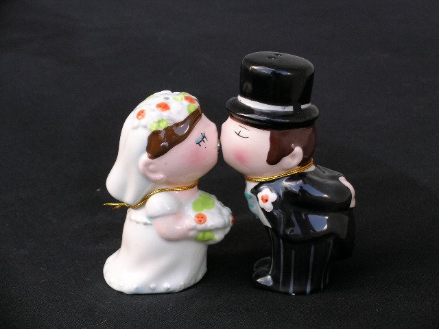 Przezabawna i przeurocza para solno-pieprznych nowożeńców przyłapana na miłosnym, pełnym obietnic pocałunku :) Porcelanowa, fantastyczna, bo w ustach obojga magnesiki zaklęte, więc zawsze są razem ! Super kreska, super zdobienie, super kolory - sama słodycz :) Razem liczeni - 10 x 4 x 9 cm. Nowi ci nowożeńcy - stan zachowania bardzo dobry.