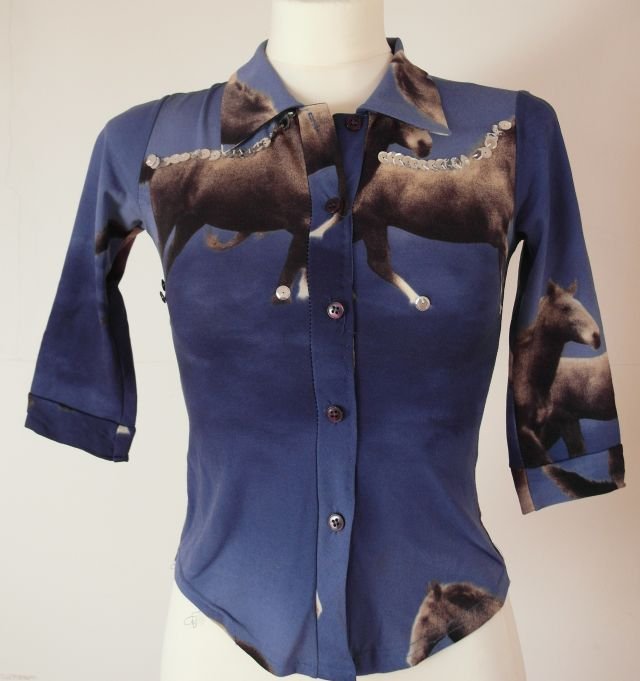 Kolor - cieniowany niebieski, motyw koni z naszytymi cekinami.Rękaw 3/4, dosyć elastyczna. Z lekkim przymrużeniem oka.