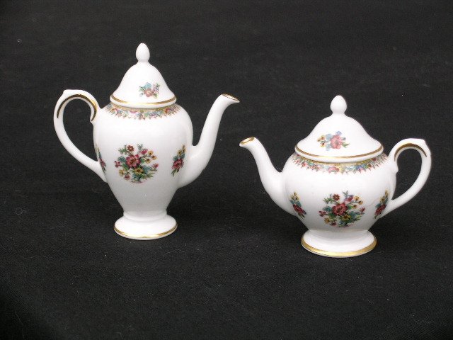 Absolutny Rarytas kolekcjonerski :) Porcelana sygnowana jakością Coalport Bone China z serii Ming Rose w miniaturowej formie - ze wszystkimi szczegółami wzoru i papierkowa cienkością porcelany; Przepiękna rzecz; Dwa imbryczki - czajniczki o wielkości niezwykle imponującej - wysokość większego z przykrywka 7,5 cm,szer 7,5 cm;średnica dołu 2,5 cm; otwór 2,5cm; Mniejszy,bardziej pękaty wys 6; szer 7 średnica dołu 3; otwór 3 cm;