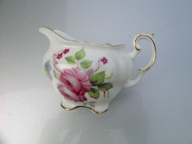 Uroczy,kobiecy Porcelanowy Mlecznik sygnowany jakością COALPORT Bone China Made in England SHREWSBURY. Klasyczna forma,delikatne kwiatowe zdobienia na cieplej bieli porcelany.Miły dzwięk. Zakręcone ucho,niby stópki. Klasa. Wzór po obu stronach inny, w jednej tonacji utrzymany. Złocenia na rantach i uchu.Calośc na satynowo-blyszcząco wykończona Kolory wzoru miękkie,miłe dla oka choć żywe.