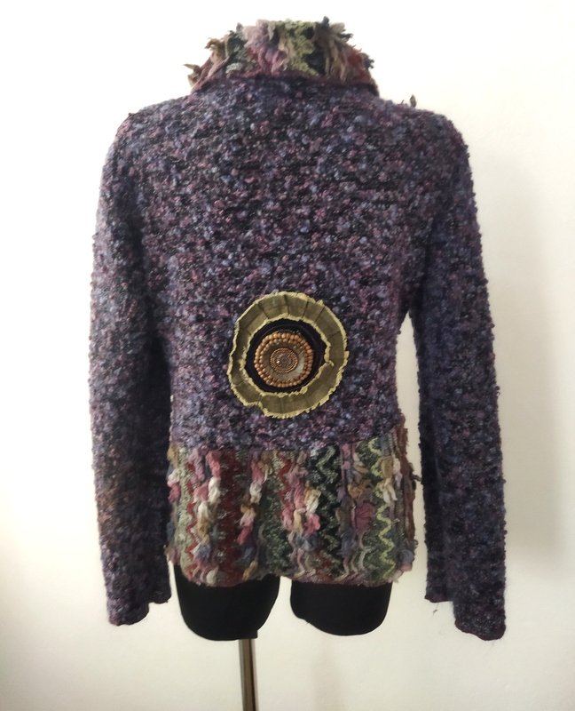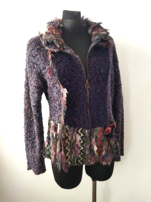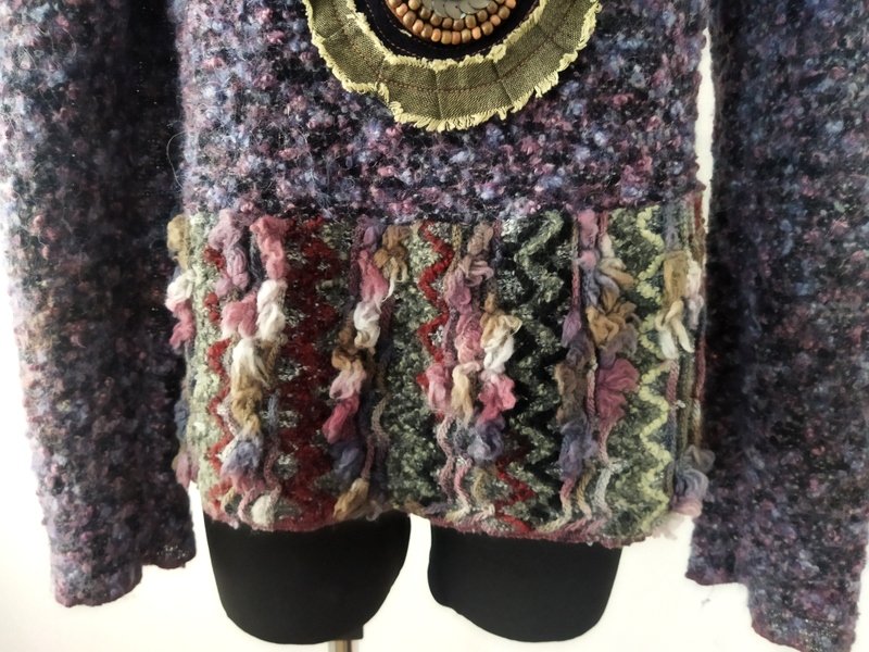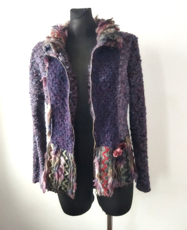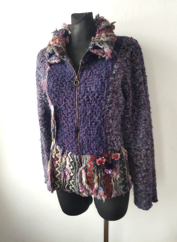 Unikatowy fantazyjny sweter z ozdobnych włóczek z dużym udziałem wełny w składzie, w większości z fakturą boucle w kolorystyce z dominacją odcieni fioletu, Zdobiony aplikacjami z włóczek , tkanin i koralików. Zapinany na zamek.