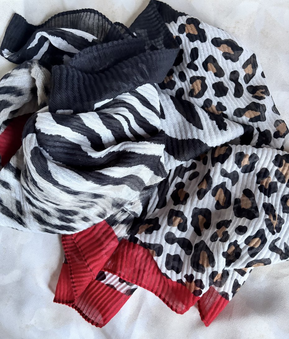 CODELLO -duży , miękki , gnieciony szal - pareo. Bardzo efektowny , drapieżny :) Naturalne barwy zwierzęcych printow . Jeden brzeg czarny , drugi czerwony . Metka firmowa . Brak metki ze składem , ale jest to materia z pewnością naturalna , bardzo przyjemna i miękka w dotyku , marszczona mgiełka .Nie trzeba prasować :) 90 x 220 . Stan zachowania - ogólnie dobry , brak metki ze składem , drobne ślady użytkowania.