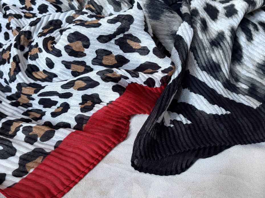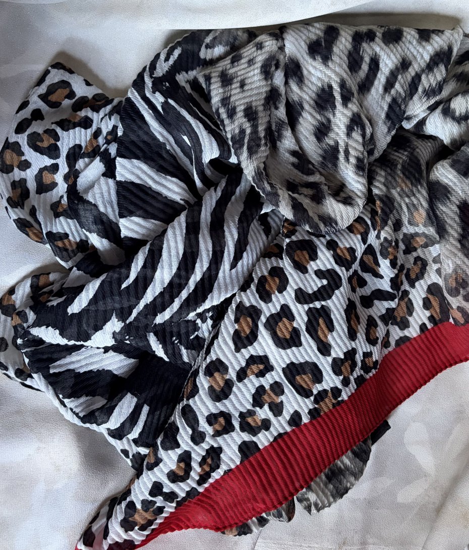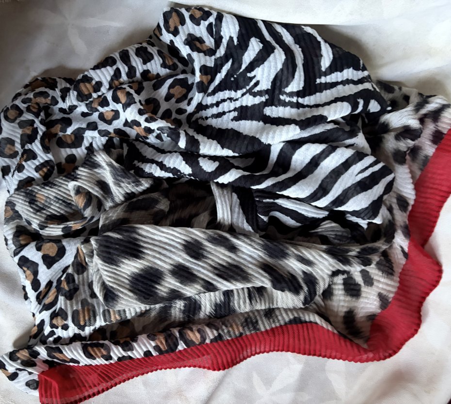 CODELLO -duży , miękki , gnieciony szal - pareo. Bardzo efektowny , drapieżny :) Naturalne barwy zwierzęcych printow . Jeden brzeg czarny , drugi czerwony . Metka firmowa . Brak metki ze składem , ale jest to materia z pewnością naturalna , bardzo przyjemna i miękka w dotyku , marszczona mgiełka .Nie trzeba prasować :) 90 x 220 . Stan zachowania - ogólnie dobry , brak metki ze składem , drobne ślady użytkowania.