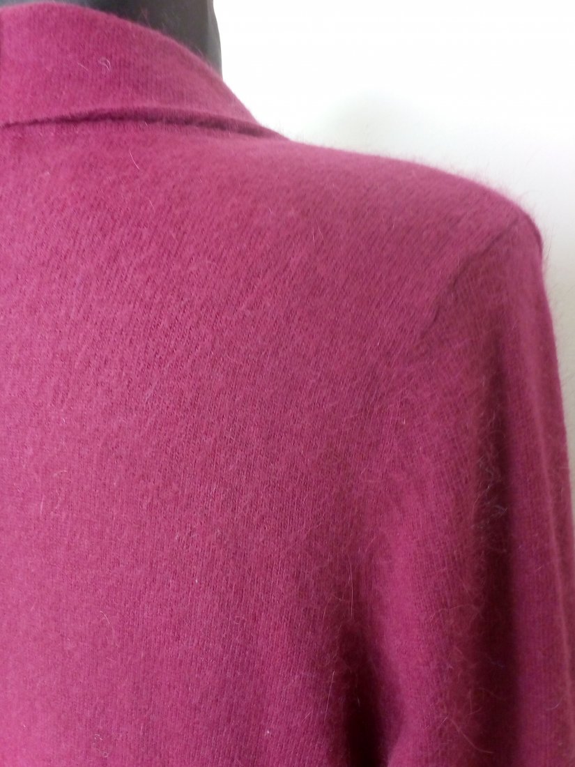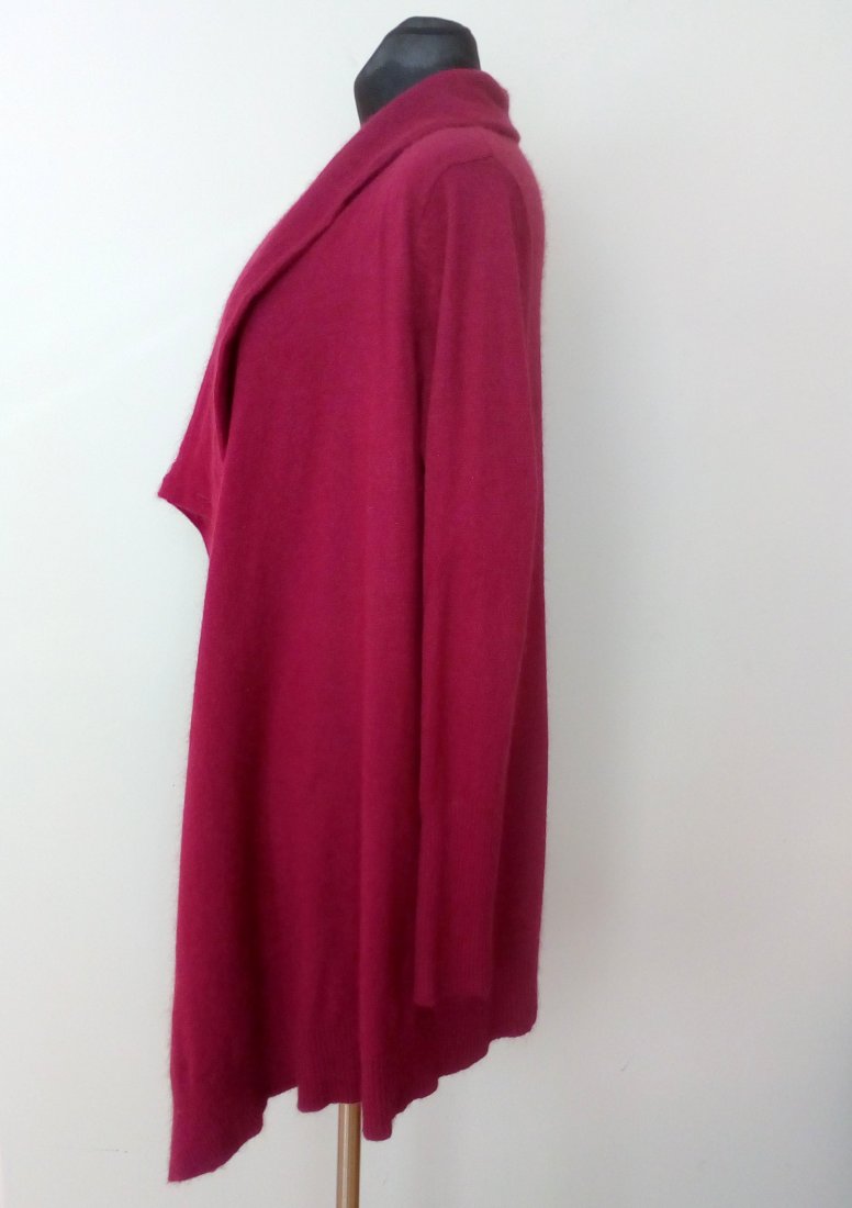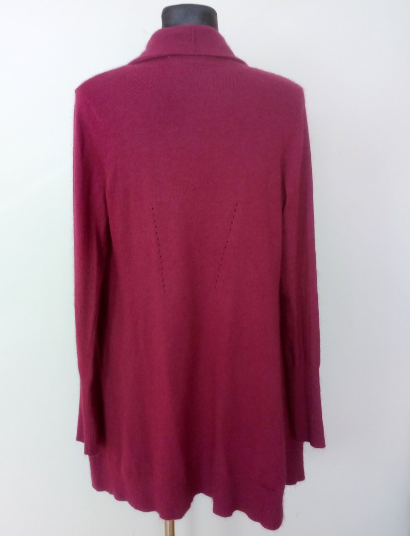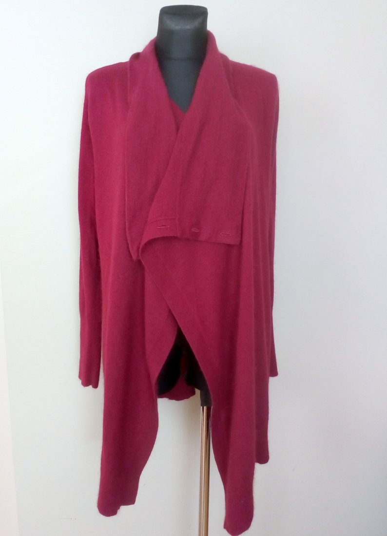 długi sweter w czerwonym/ burgundowym kolorze, fason bez zapięcia - poły przodu można dowolnie podpinać broszką, ponieważ całkowicie zachodzą na siebie, ściągacz u dołu swetra i przy rękawach