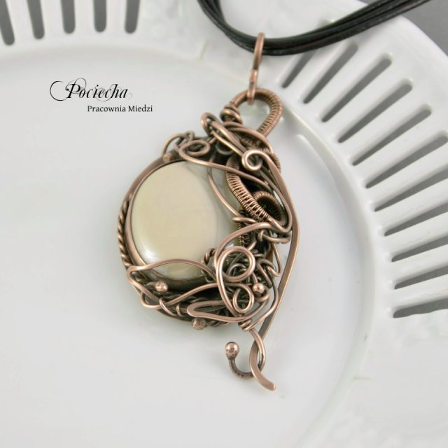 Naszyjnik stworzony od podstaw ręcznie pracochłonną techniką. Miedź połączyłam z pięknym szklanym kaboszonem o barwie jasnego beżu.