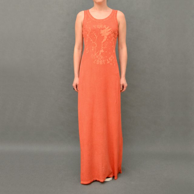 Świetna sukienka w kolorze pomiędzy pomarańczem a czerwienią. Kolor lekko dekatyzowany, co ma na celu postarzenie sukienki. Dodatkowo przy szwach i dekolcie jest lekko wybielana. Super efekt nie widoczny na zdjęciach niestety. Po środku aplikacja - również wyglądająca na starszą. Polecam serdecznie.