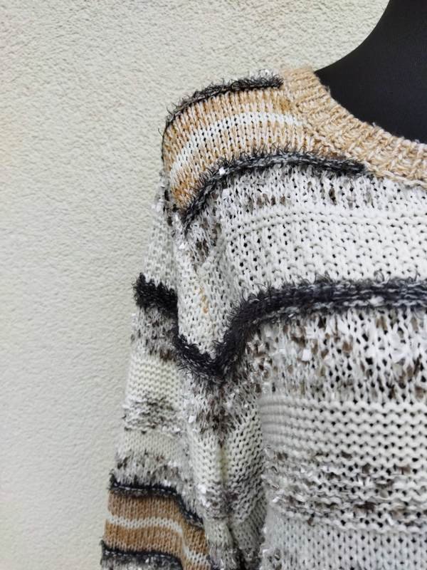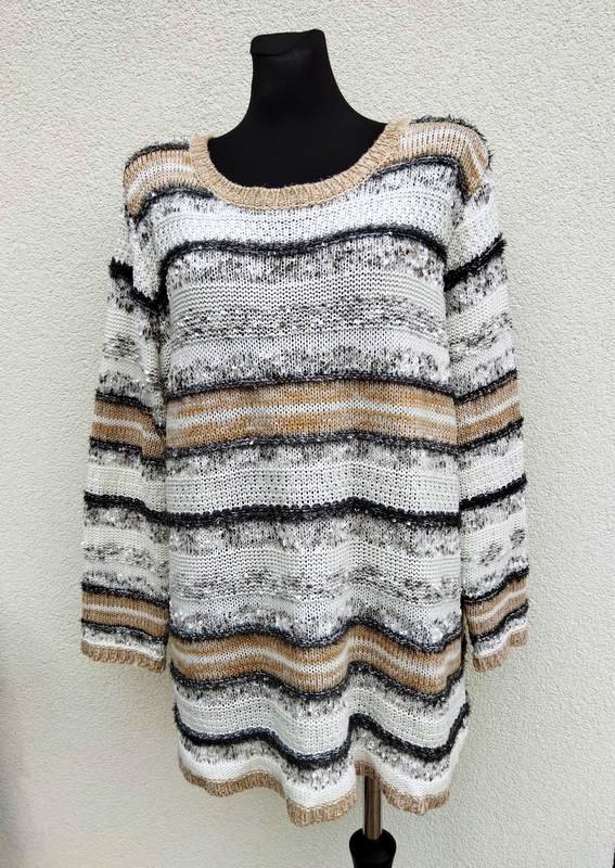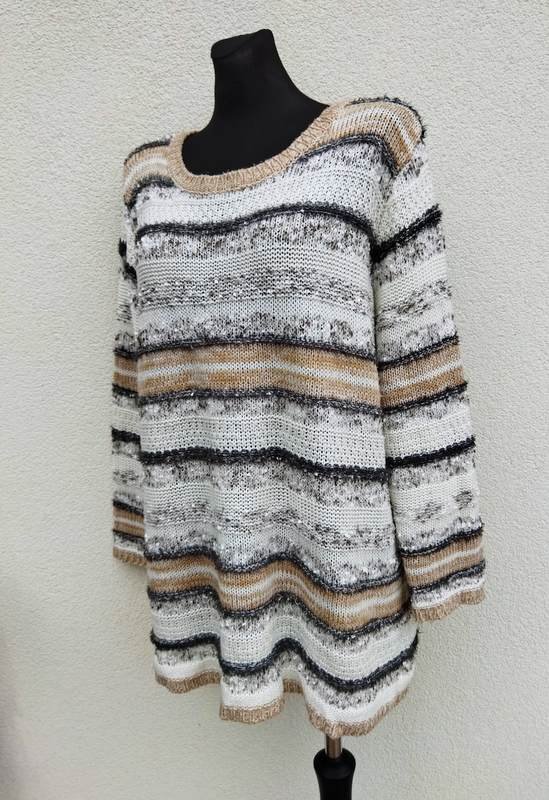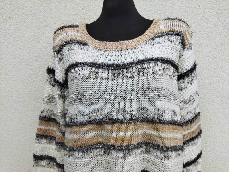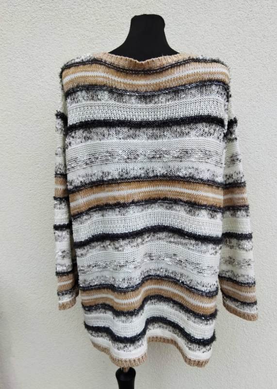 Miły sweter w paski, z akrylowych włóczek z poliestrem gładkiej w w kolorach bieli i beżu oraz kosmatych w dwóch odcieni szarości, z których jedna lekko błyszcząca. Wykończony wąskimi ściągaczami.
