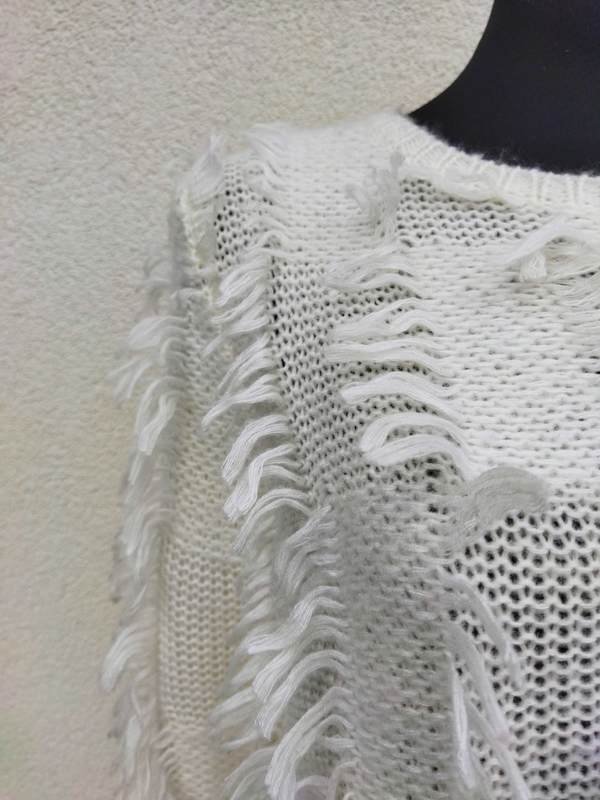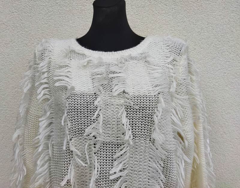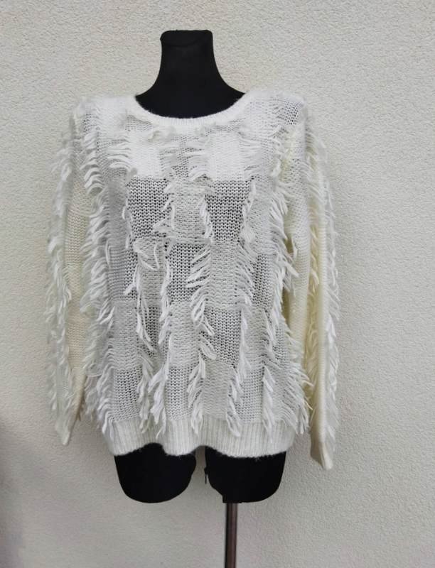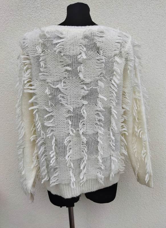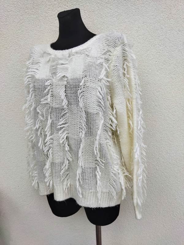 Ciekawy sweter z akrylowej włóczki w kolorze ecru , z wkomponowanymi frędzelkami. Wykończony ściągaczami. Miły , podatny i bardzo efektowny .