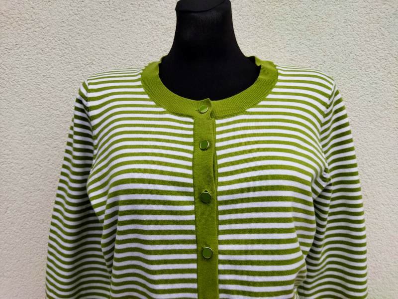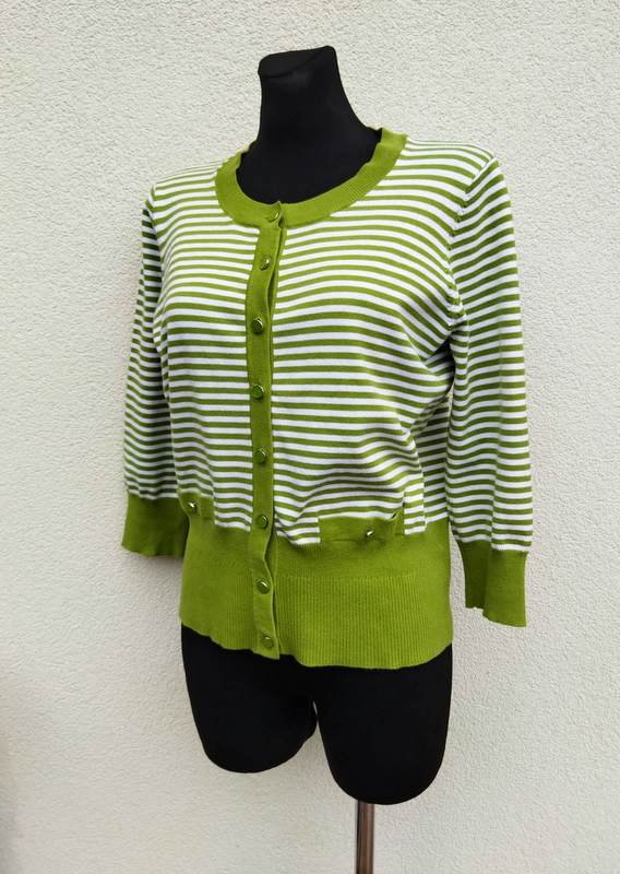 Skromny a zarazem uroczy sweterek w paseczki w bieli i groszkowej zieleni na wyższym ściągaczu. Owalny dekolt, rękawy 3/4, u dołu imitacja dwóch kieszonek. Zapinany na ozdobne guziczki w groszkowej zieleni w srebrnej obwódce . Sprawdzi się w codziennych stylizacjach.