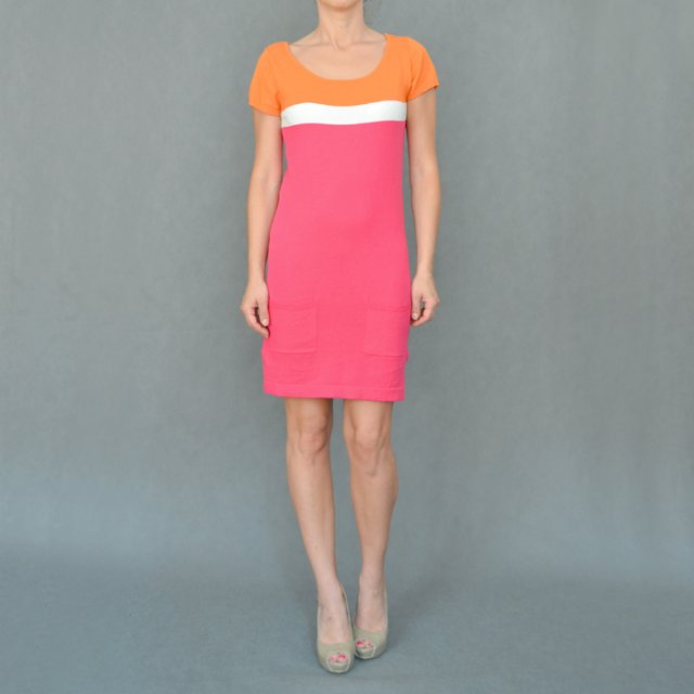 Dzianinowa sukieneczka z kieszonkami na dole w mocnym odcieniu różu i pomarańczu. Oddzielone białym pasem.